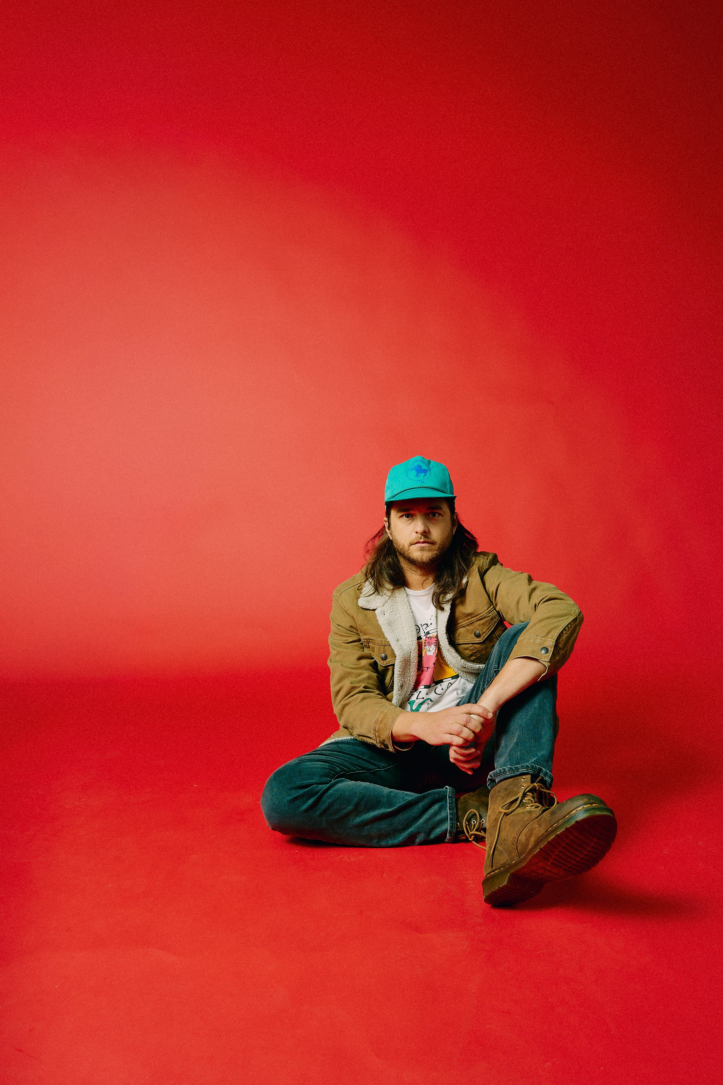 A man with long hair and a beard sitting on the floor against a red background, wearing a tan jacket, a white graphic t-shirt, blue jeans, tan boots, and a blue cap.