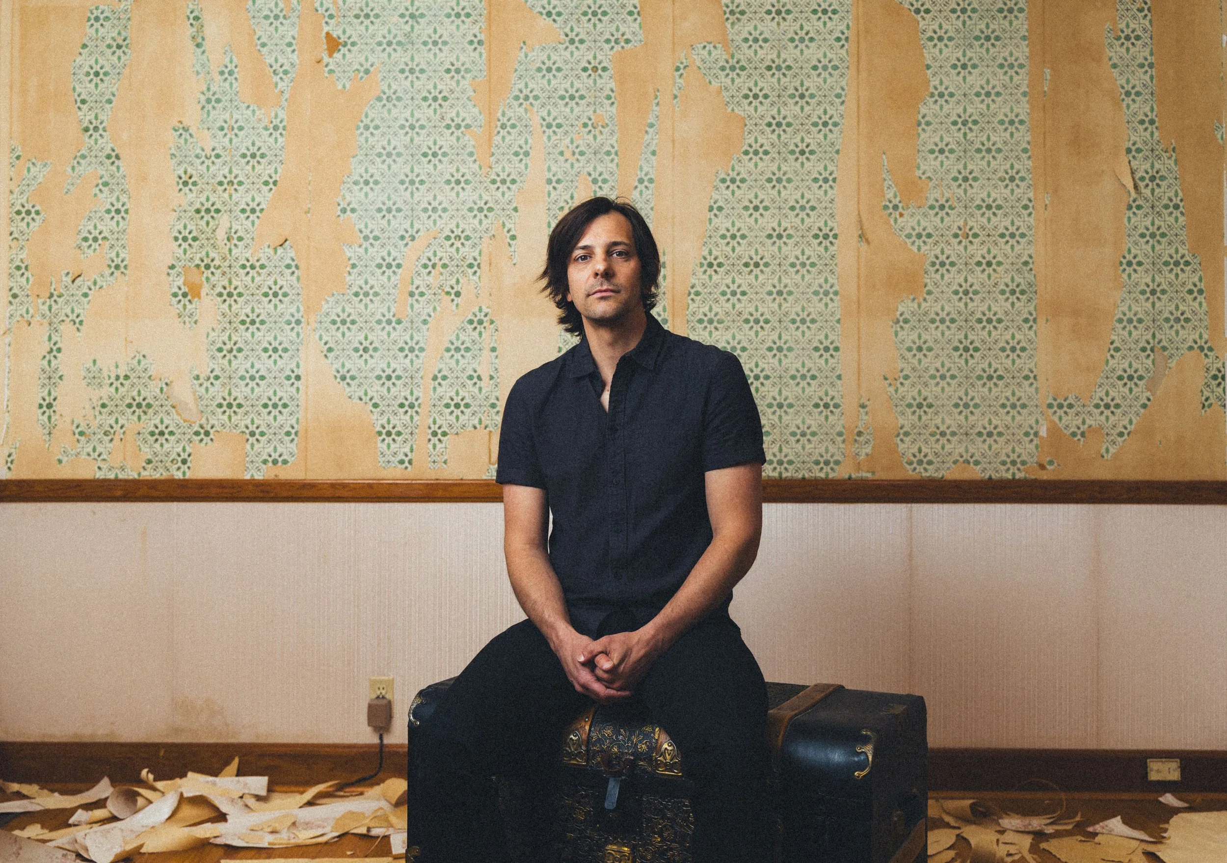 A young man with dark hair, wearing a black short-sleeve shirt, seated on a vintage trunk in a room with peeling wallpaper, papers scattered on the floor, and a power outlet on the wall.