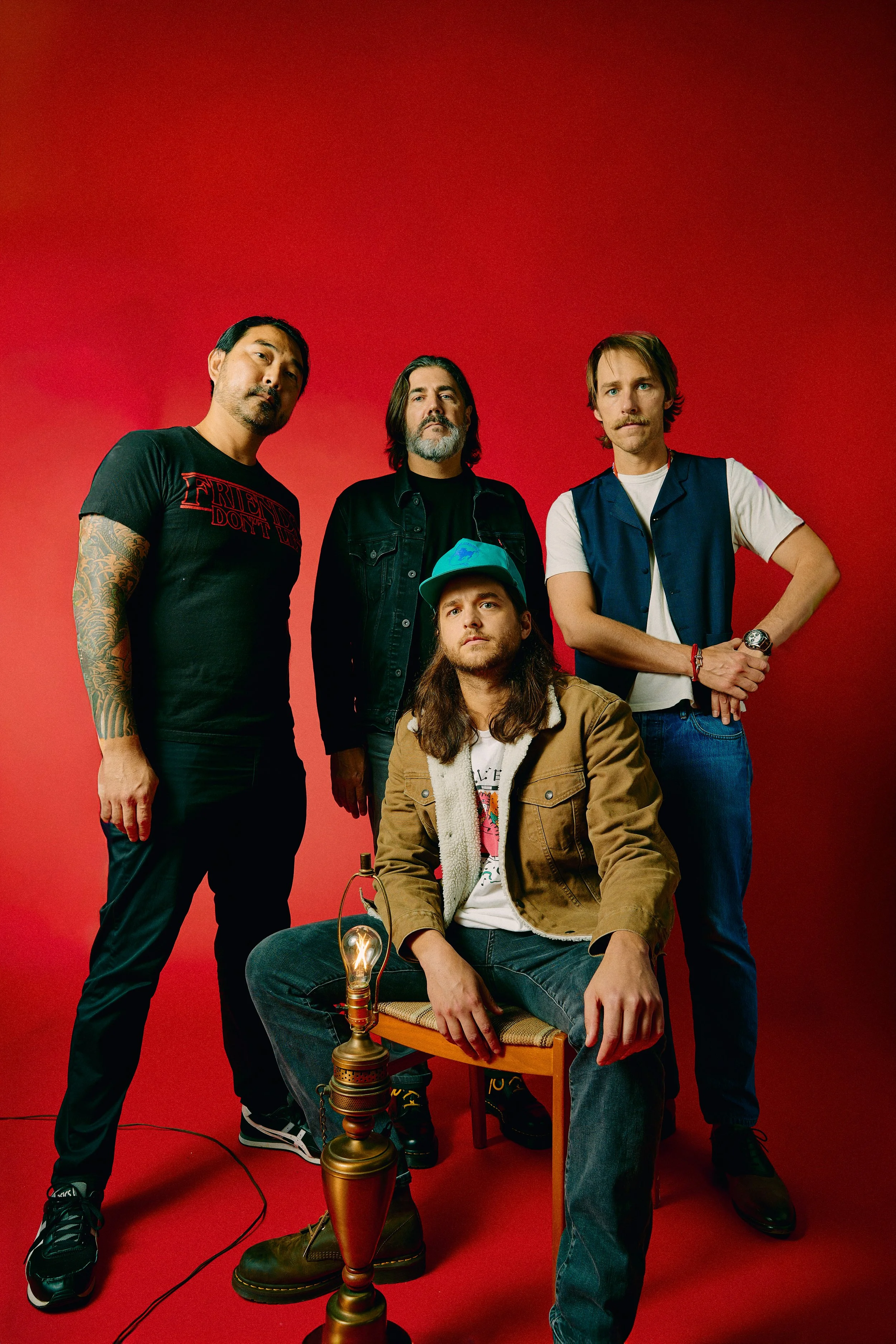A group of five men, posing against a red background, with one seated and the others standing. The seated man wears a blue cap, brown jacket, and jeans, with a vintage lamp in front of him. The standing men wear casual clothing, with one in a black t View fullsize